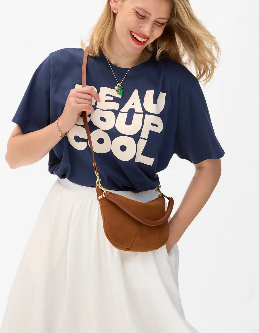 A smaller size zip top mini messenger bag to wear every day all year round. Fully lined in chambray. Wear with a shorter shoulder strap, or cross body. Made of smooth nubuck leather.