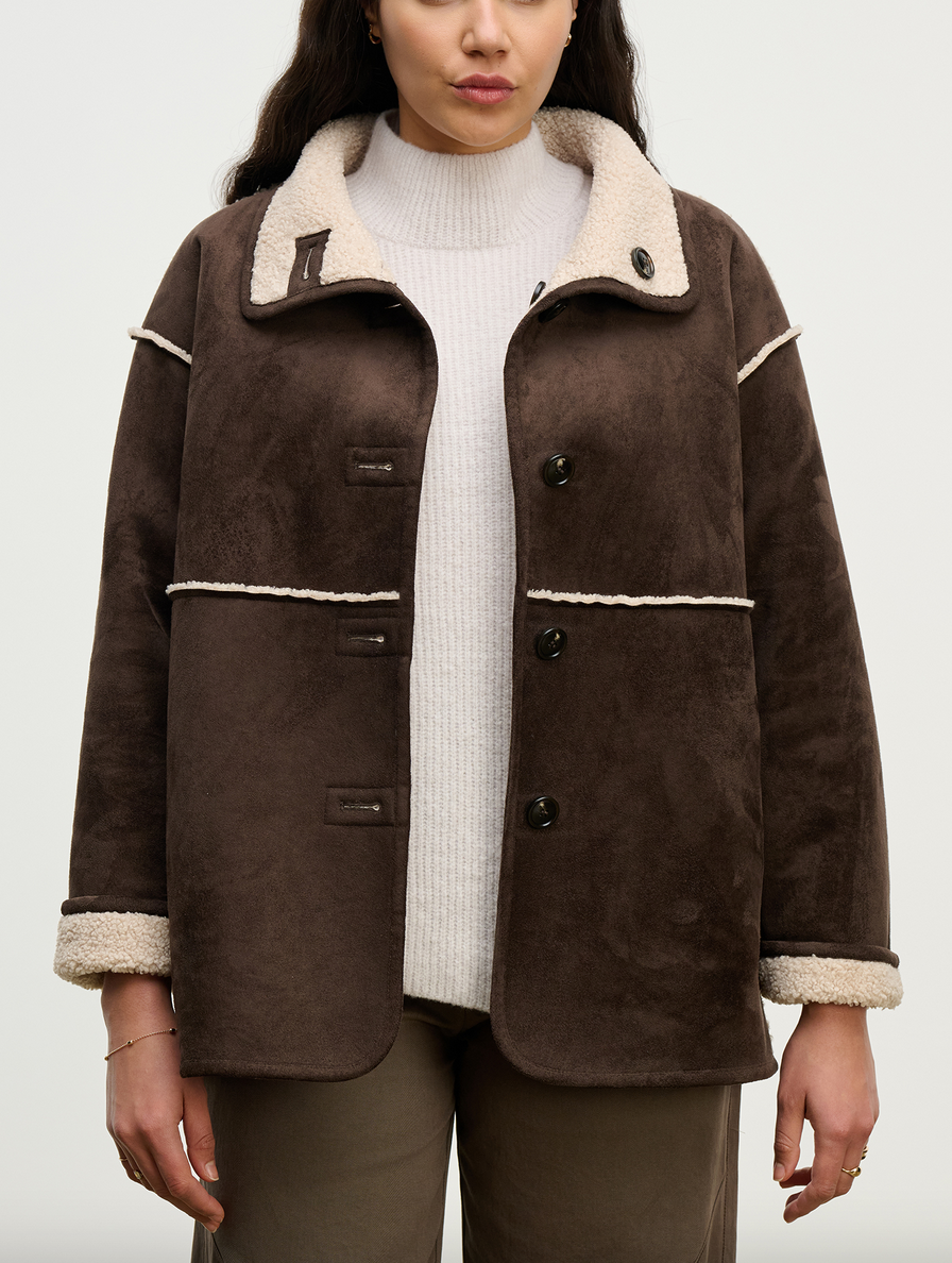 A gorgeous layer for cold weather this jacket is faux shearling with a sherpa inside layer. A pretty dark chocolate exterior with a creamy white sherpa inside makes this cozy and chic. Pointed collar and button closure. Easy coat style fit. Side pockets.